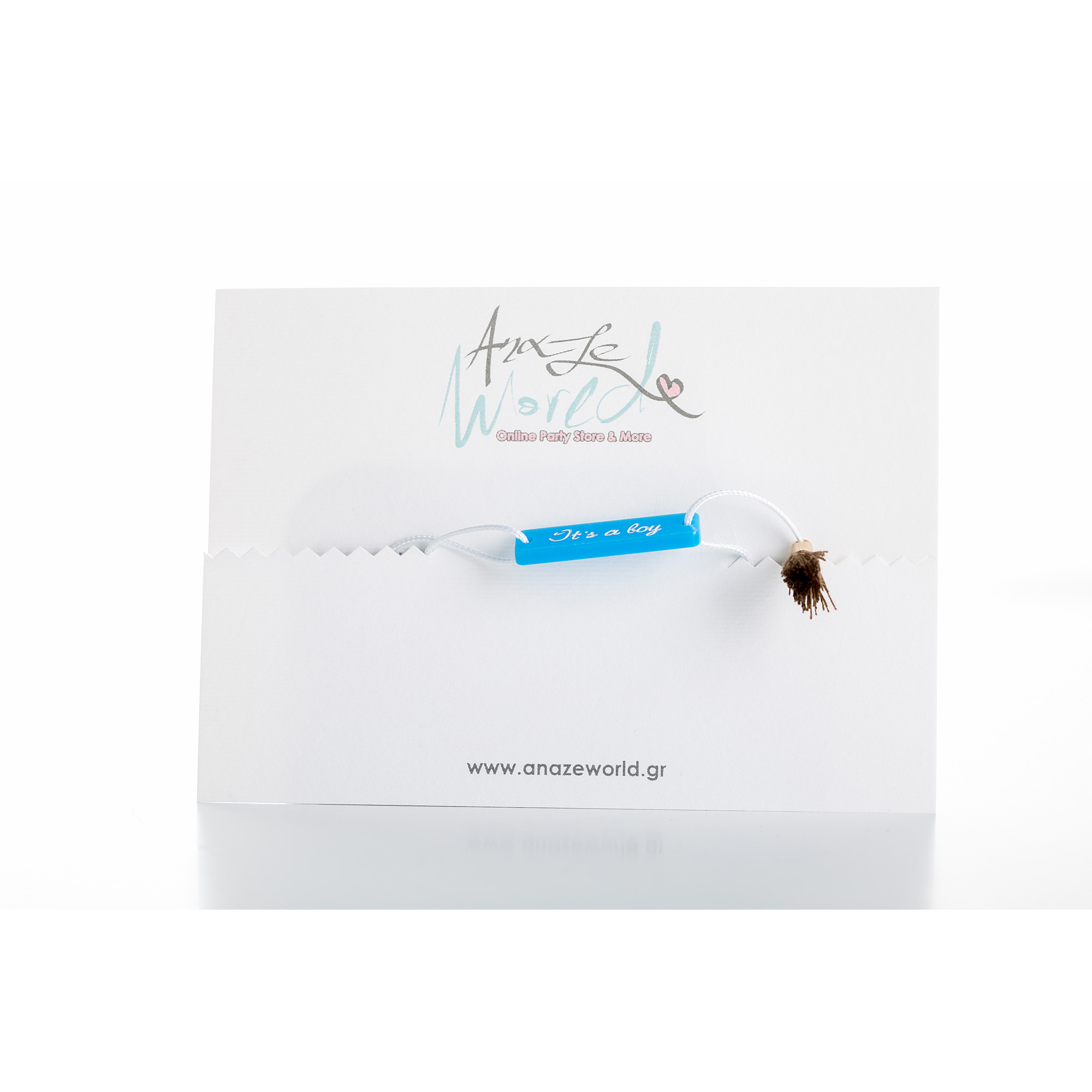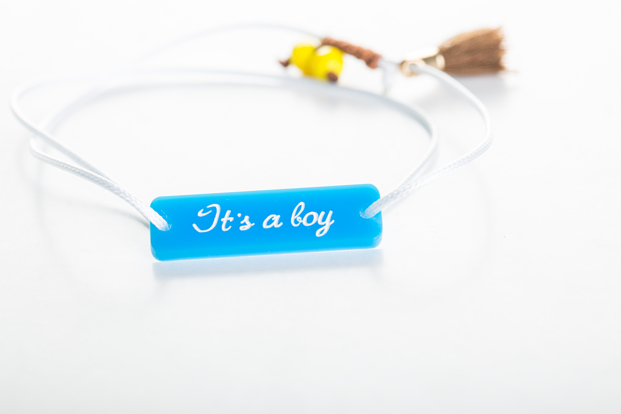 Βραχιολάκι «it’s a boy» με αυξομείωση μακραμέ. Plexiglass ταυτότητα και πολύτιμες πέτρες συνθέτουν ένα ιδανικό δώρο για τη φίλη σου (mommy wanna be), τη μαμά σου και φυσικά όλες τις μαμάδες του κόσμου.